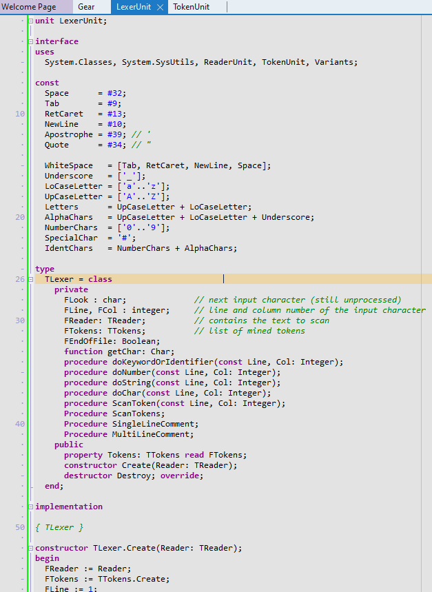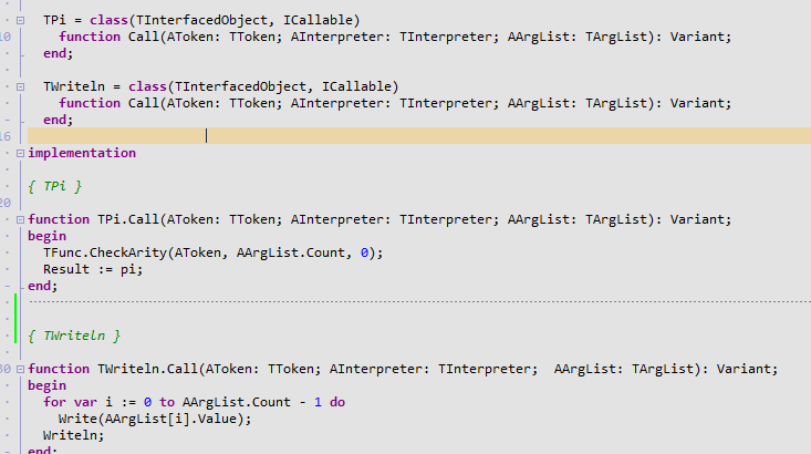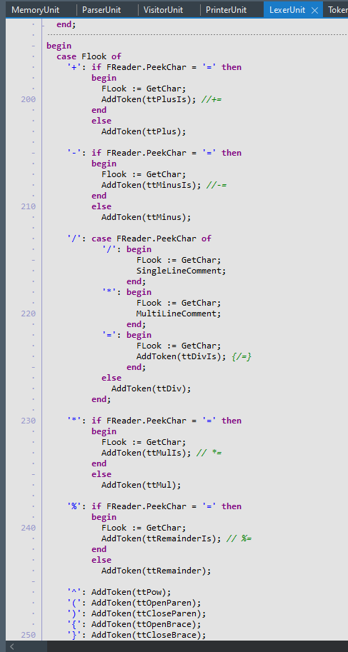 Начал её серьезно читать и собственно делать сам интерпретатор. Книга достойна отдельной темы. На всякий, еще раз ссылка для скачивания https://cloud.mail.ru/public/1KND/xbMLrR7a4 Буду считать это, как сейчас модно говорить, "Codnig kata". Да и просто развлечение. Даже сделал проект на гитхабе ) Кое что приходится менять, но по мелочи. Чем больше ее читаю, тем больше нравится паскаль :) Хорошая идея, что структуру класса можно сразу посмотреть в сжатом виде. На шарпе приходится листать портянки, чтобы понять что собственно класс делает. Ну или сворачивать, но это действия предпринимать. Зацените мою цветовую схему в делфях )А во free pascal оказывается есть всякие приятные мелочи типа += и присваивания в блоке var. ... |