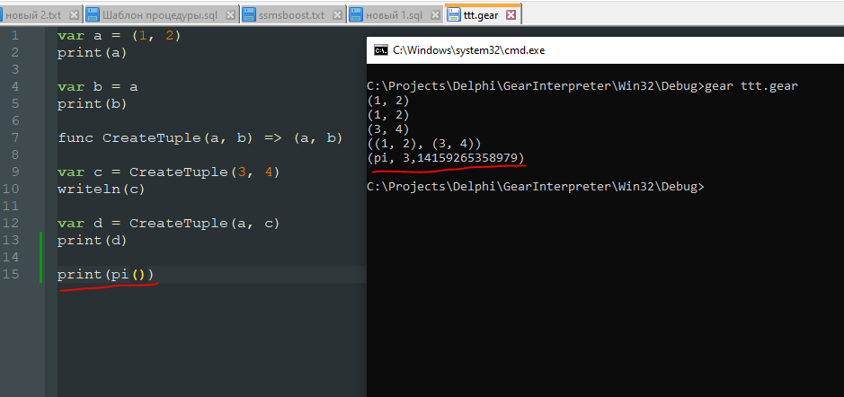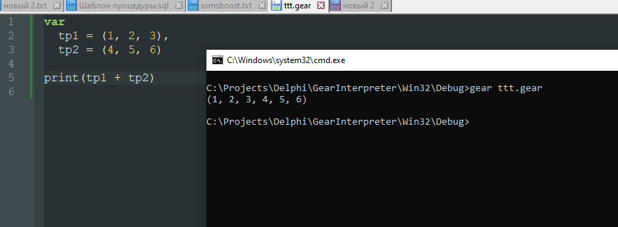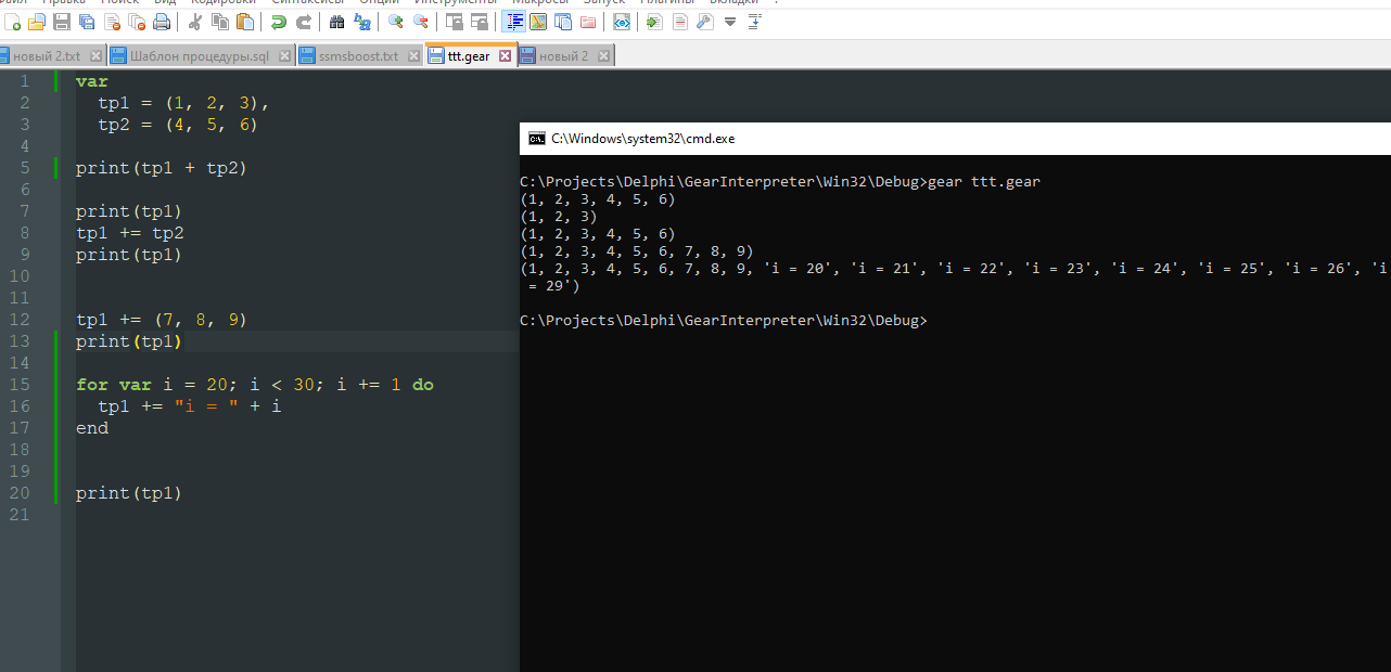 Решил протестировать, сделать "стандартную функцию языка", которая будет возвращfть tuple. То есть эта функция, которую я пишу в Delphi, и которая потом будет использоваться в данном скриптовом языке будто это встроенная функция. Программиста тут заботит только параметр AArgList, в данном случае он пустой. Код: Delphi 1. 2. 3. 4. 5. 6. 7. 8. 9. 10. ... |
