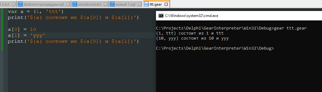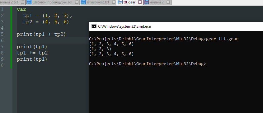 Только трюков типа (a, b) = (b, a) тут не получится. В этом интерпретаторе у него изначально всё как говорится ByVal. Все переменные и константы это Variant. Это ведь просто доработать присваивания. добавить если слева и справа кортежи, то просто присваивать в цикле. Делов-то :) ... |