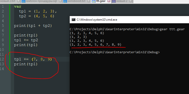 Добавил сложение кортежей. Это уже в 12й версии :) Нужно переделать кортежи в списки, потому что они уже и есть списки во всем, кроме названия. В них можно добавлять элементы, их можно складывать. Нужно переделать их с круглых скобок на квадратные и везде в коде Tuple заменить на List. ... |