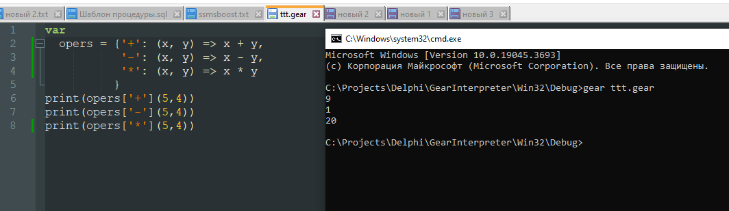Интерпретация Dictionary уже работает. С хэшами плюнул, в этом интерепретаторе всё хранится в Variant, не переделывать же сейчас всё на TObject. А с Variant 1 и '1' это одно и то же. Решил пойти по простому пути, ключом в словаре может быть только строка, все остальное будет приводиться к строке. Собственно, цель словаря в этом интерпретаторе будет только для упрощения получения данных с датасетов. Чтоб можно было обращаться примерно так Код: Delphi 1. 2. ... |