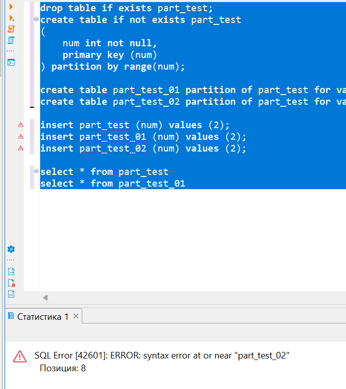Щас ябусь не понимаю как сделать корректно секционирование... без наследования. Простая таблица определил 2 секции - DDL - скрипт выполняется норм: Код: SQL 1. 2. 3. 4. 5. 6. 7. 8. 9. Код: SQL 1. 2. 3. ... |