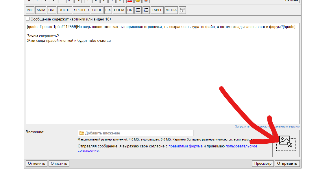 Но ведь после того, как ты нарисовал стрелочки, ты сохраняешь куда-то файл, а потом вкладываешь в его в форум? Жми сюда правой кнопкой и будет тебе счастье ... |