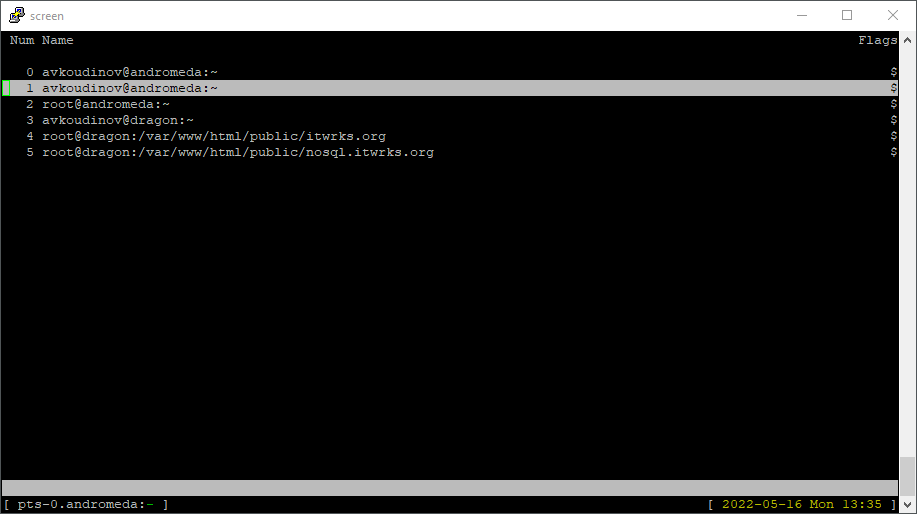 - не нравится кривой screen, из дистрибутива в дистрибутив, в последний раз у меня сломался при переходе с 10 на 11 всерсию. Что там кривое - танцы с бубном при настройке отображения заголовков окон, например, работа курсора мыши, вечно отваливается. нет такого в шапке. Для представления, вот запущенный скрин с сессиями до серваков форума. Теперь представь, если их много и я вижу вместо надписи названия сервера и рабочей диреткории просто screen screen screen и никакой вообще информации? А вот ещё чтобы заголовок динамически менялся при логауте, например, тут в дебиане начинается хрень и мозгоёбство. В шапке нет такого, ещё при обновлении у меня сломалась мышь в vim если через скрин работать, тоже гуглить пришлось, ещё блоки красит белым при выделении, а в шапке нет такого. Короче, в дебиане хреновое взаимодействие screen и xterm + сам скрин какой-то не тот, либо в шапке допиленный, а дебиане для тру задротов. ... |
