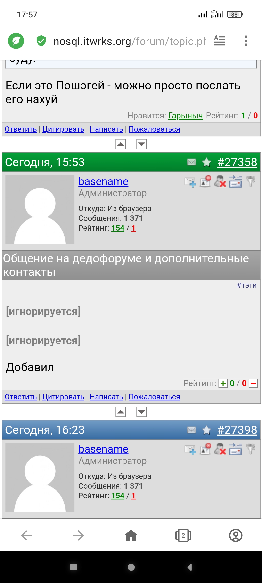 ##### Дедофорум https://nosql.itwrks.org/ - основной адрес. С домена itwrks.org отправляются письма. https://sqlZ.ru/ https://www.sqlZ.ru/ - ДедофорумZ для патриотов РФ в зоне .ру. ##### http://status.itwrks.org/ - информационная страница на отдельном сервере для оповещений в случае аварий, технических работ, непредвиденных ситуаций. https://t.me/it_works_org - сюда бот будет отправлять оповещения в случае недоступности форума. https://t.me/it_works_org_grp - группа для общения участников форума в Telegram. https://t.me/dedoforum_a - группа Дефекатора. https://nanochat.ru/dedoforum - Элитный Пошэчат fashion glamour style luxury для оперативной, наносекундной связи В случае, если не приходит активация, я долго пропал и что-то в этом духе - можно отправить письмо сюда: anton@itwrks.org ##### ############### ############### Правила форума Создам здесь некий дисклаймер по поводу общения на форуме, так как другие разделы, правила и т.п. мало кто читает. Касается всех форумом дедофорума. Благодаря товарищу Конякуле, ПО02 привязал домен nosql.ru к адресу, никак не связанному с данным сервером, где открывается информационная страница и старые пользователи стали потихоньку возвращаться. Процитирую деда: Цитата [игнорируется] ВНИМАНИЕ В связи с событиями в России и в Мире, существование дедофорума в прежнем формате и с прежними правилами больше невозможно в обозримом будущем. Множество сообщений, которые ранее были допустимыми, сейчас могут представлять угрозу для их авторов. Чтобы не утратить наше комьюнити, дедофорум был поднят заново с чистого листа здесь: nosql.itwrks.org с жесткими ограничениями и правилами обсуждения политики. Форум, техническая площадка, арендатор технической площадки и доменных имён находятся в юрисдикции РФ. Соответственно, соблюдение действующего законодательства РФ - в приоритете, вне зависимости от обид, пожеланий и субъективного мнения. Это касается и других форумов, но Политики прежде всего. Призывы, розжиг, ненависть, экстремизм, майданчество, скачки, навальничество, приглашения на мирные митинги, горлорезство и т.п. - ЗАПРЕЩЕНЫ! По тем или иным причинам не работают уже 2 ресурса: sql.ru и nosql.ru. Не подставляйте себя и товарищей и не привлекайте внимание контролирующих органов. Постарайтесь, пожалуйста, соблюдать умеренный формат обсуждений. P.S. Требования для всех участников дискуссии по разную сторону баррикад. - Не создавайте провокационные темы, ники, особенно на злободневные и кликбейтные вопросы, политические и религиозные. Никому не известно, кто может возбудиться на глупую шутку и толстый троллинг по ту сторону монитора, а последствия могут не понравится автору и негатвино отразиться на комьюнити. - Ещё раз, в обсуждении вопросов политики и религии прошу соблюдать максимальную умеренность, корректность и абстрагироваться от эмоций - И ещё раз, осторожнее с картинками, видео, репостами на политическую и религиозную тему - Не надо сюда нести инсайд из контор, где вы работаете. ВТБ, Тинькофф, ФСБ, особенно постить внутренние документы, распоряжения, переписки корпоративных чатов особенно с ДСП. - Не надо обсуждать наркоту, хотя у нас вроде нарков не было никогда, постить эротические фото девушек, внешность которых вызывает сомнение в их совершенолетии и тем или иным образом нарушать законодательство РФ. Банить никого не хочется, сомнительные сообщения - на удаление. Для непонимающих утырков и шнырей, хотите заявить протест? Выйдите из под ника на форуме из-под 