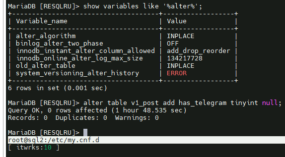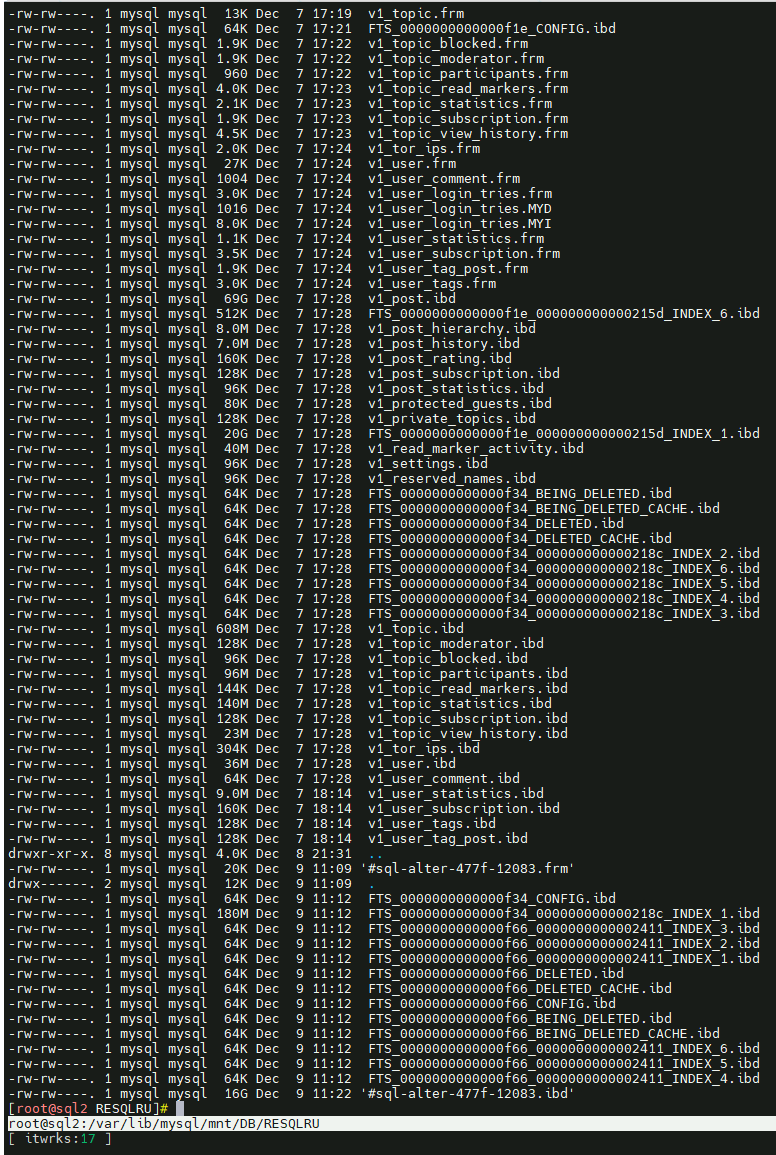 Поводы были. Просто неправильно было винить апи и хотелки пашэ. Проблема в том, что админ нуб, опыта с субд нет, чего-то не понимает и не может диагностировать. Вот и вся проблема. А отсылка к Пашэ, к багам в Марии - ну это последнее дело. Что-то неверно настроено и всё. Я на 99% уверен, что проблема в какой-то настройке Марии. Не может вот это не создать колонку на таблице в 70 гигов. Это что за стёб? У людей терабайтные базы работают нормально тут объем всех БД 160 гигов и табличка в 70 гигов, она колонку не может добавить? Если будет виртуалка можно поэкспериментировпть неспешно. ... |