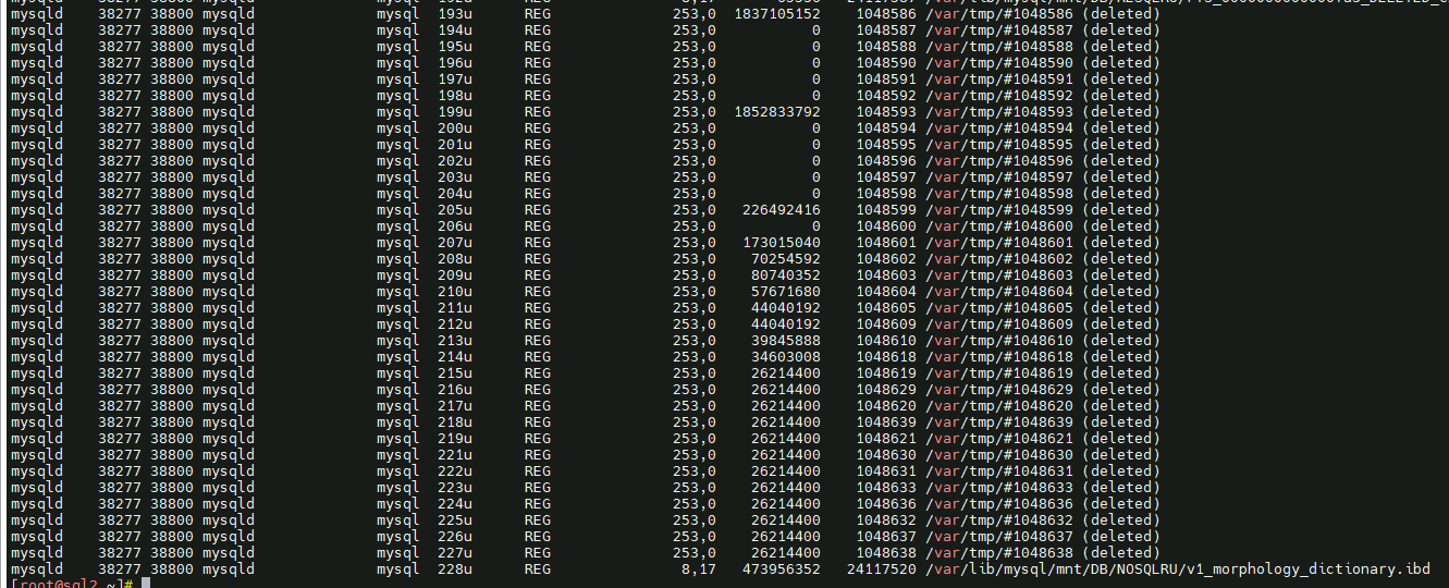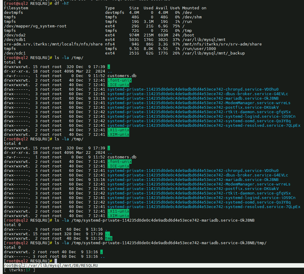 Как я и говорил - проблема в админе и ресурсах: отсутствие опыта и знаний. а Маша, как любая девушка, капризная и люит играть на нервах.В чём была проблема, она пишет не в /tmp, а в /var/tmp, который смонтирован обычно, в корень. И куда она пишет - сразу не очевидно, но поможет увидеть программа lsof. Размер корнеовго раздела был 32 гига, что не хватало ей для записи и она вываливалась. Заметил случайно на скринах, которые постид, а кто место ест то в корневом разделе? ... |