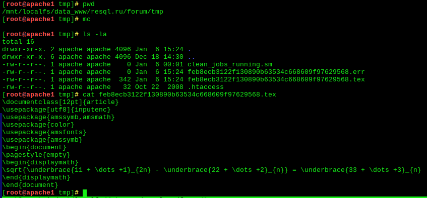 Да. Ты использовал, наверное, что-то дебиан подобное, там скорее всего это по-другому работает, в шапкоподобных по другому и, видимо, ещё и в реализациях отличается, потому что на старом сервере правили и вроде бы работало нормально. В общем я чуть выше написал, - нужно создать окружение, ну например в /home/apache, соответственно ему права дать туда срать - опционально, я принудительно запустил от апача из консоли генерацию текстовой формулы, оно что-то там скомпилировало, высер что высрало - тоже выше в логе, не знаю, надо это или нет, все файлики необходимые тестовые создало. - дальше selinux настроить. Он уже детальнейше пишет что не нравится + пришлось для конвертатора в пнг создать selinux модуль. Последний пункт для млей ОС точно нужен. Как для шапкоподобны - не знаю, возможный вариации, возможно модуль компилить не надо, хотя вряд-ли. Насчёт первых двух не совсем уверен что всё это действительно надо, но тем не менее в 2022 я делал подобное и сейчас формулы работают. Этот момент детально с командами зафиксирую в основной теме по этой проблеме. Тут человек интересуется, может ты знаешь? https://resql.ru/forum/topic.php?fid=65&tid=2187110&msg=40139208 ... |