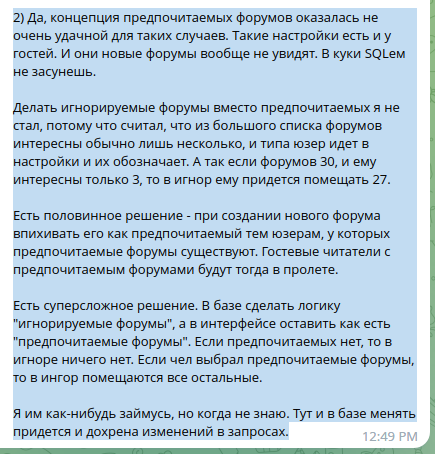 Решил вынести в отдельную тему.. Надо было раньше тему создать, ну ладно. В субботу будет большой патч Предполагаемая недоступность форума - суббота ) Владаечка, прости, на время сломаются лайки дизлайки, местоположение, лайки справа, дизлайки слева. будет как раньше, потом я подправлю, либо создам дополнительный скин. накидайте замечаний по работе форума в плане функционала , в плане юзабилити, возможно заметили какие-то баги, либо мне сообщали о них, напомните. Если косметические правки, возможно дед успеет подправить. ##### 1. Перепутаны оценочные действия при отключении дизлайков 162014 2. у тех. кто выставляет предпочитаемые форумы не отображаются новые форумы 125682 3. баг с отображением стрелок при просмотре картинок 228217 Уже пофиксено. ##### Пишите замечания. P.S. помню тех, кто жаловался на что-то, пишите Владайка cat2 PaNik Горбатый ёж Просто Трёп Sparrow 1. В работе. Баг дедой подтверждён. Будет исправлено 2. Трудлемко. правится не будет. Смысла нет. При создании новых форумов запрос будет вручную 3. Пофиксено в предстоящем патче Пишите, не стесняйтесь. ... |