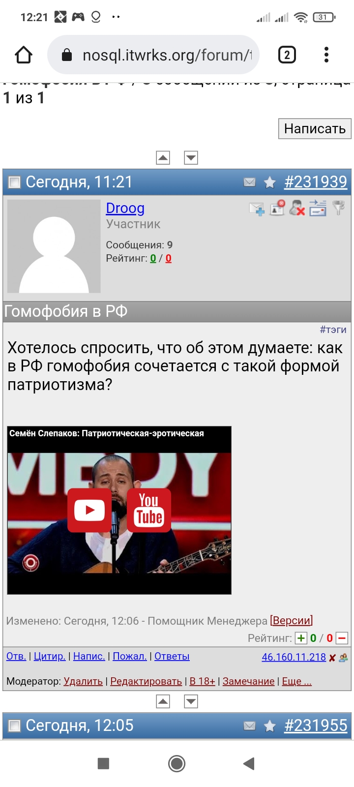 Вышел патч. Устранены баги: - Перепутаны оценочные действия при отключении дизлайков - У тех. кто выставляет предпочитаемые форумы не отображаются новые форумы Переписана логика. Кто пользуется функцией, вам придётся заново выставить предпочитаемые форумы. В дальнейшем при создании нового форума он будет виден по умолчанию Цитата [игнорируется] Переход на инвертированную логику игнорируемых форумов оказался проще. Получилось отсавить логику preferred forum не только в интерфейсе профиля но и во всех запросах. Зачитываем - чекаем форумы только те которые не в списке. Сохраняем тоже только те которые не в списках. После наката юзерам придется перенастроить свои предпочитаемые форумы и все. Новосозданные форуме не будут по умолчанию заигноренными - даже для гостей. - Баг с гостевым постингом от Пашэ Цитата [игнорируется] Возможно регистрация необходима как раз под той же сессией что и залогинеенный ник:) У меня есть такой код в регистрации Чтобы затрэкать посещение под айди только что зареганного юзера $_SESSION["user_id"] = $uid; $_SESSION["user_name"] = reqvar("user_name"); $this->track_hit("", ""); unset($_SESSION["user_id"]); unset($_SESSION["user_name"]); Т.е. выставляю его и тут же стираю чтобы трэкинг прошел под данным юзером а не под анонимом. Скорее всего он делает так 1) Логинится юзером например смузихлебом 2) В той же сессии идет регать новый ник. Ссылка на регистрацию залогиненным не видна, но регистрация работает. Опять же - регистрация доступна и гостям, проверять доступ не было резона. Теперь есть:) Буду давать отлуп если юзер залогинен уже. Типа разлогинья потом уже регай нового. 3) После регистрации user_id в и user_name в сессии старвятся на новые трэкается хит, а потом сбрасываются. Но статус logged_in остается. Вот почему пашэ мог постить только пустым гостем. Всё. Кажись я схватил его за иички! :) Готовлю патч. - Комментатор может видеть свой ip и при нажатии рядом на иконку видит все свои ip, под которым постил Цитата [игнорируется] Юзер может видеть свои IP: - В своих постах - В Профиле IP регистрации и свой последний IP Цитата [игнорируется] Пользователи могут постить под гостями Тогда залогиненные пользователи могут постить на данном форуме (только на данном) под свободными гостевыми никами. Чтобы юзеры могли запостить под гостем на соответсвующем форуме, в левом углу есть переключалка Гостевой постинг вкл./выкл. Включив гостевой постинг, при отправке сообщения даже у залогиненного юзера поле автор редактируемое и там стоит его пользовательский ник. Если автор изменил свой ник на другой, то пост уходит под гостевым ником. Если вернул ник к пользовательскому, то пост уходит под зареганным пользоватетем. Таким образом, форум можно защитить от постов незарегистрированных ананимусов, однако зареганные пользователи имеют право на анонимность друг перед другом, если не спалятся по стилю конечно:) ... |