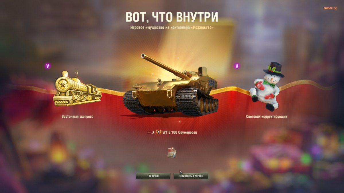 Получаю Waffenträger auf E 100 из новогодних коробок. Поехали! 1. Открываю 192 коробки за донат Насыпало много золота, серебра, игрушек и мелочевки. Из интересного TL-1 LPC, Сапсан. Танки Jagdtiger Prototype и Type 63 прибыли как гарантированный танк из каждой 50 коробки. 2. Открываю 4 коробки за золото Ничего интересного 3. Открываю 96 коробок за донат УРА!!!!!1 НАГРАДА ГОДА ПОЛУЧЕНА! ![]() ![]() ![]() Прибыл WT E 100 Оруженосец! (Тайминг 00:05:17) Выпал на 223 коробке из всех приобретённых на текущий момент. Также в этой партии К-91-122 и Об. 780. ##### Продолжаю наблюдение и буду добивать классическую Вафлю. P.S. P.S. Существует некая теория Вспышки, по которой коробки лучше открывать сразу после 09:00, вроде как шансов на выпадение ценных наград больше :) Ну, то есть якобы в самом начале марафона коробок и начала утреннего ежедневного цикла шансы увеличиваются, а потом некий лимит на особо ценные награды. Достоверно подтвердить или опровергнуть эту теорию мы не можем, но после 9 открывать коробки было явно поинтереснее :)Страшные кусты прохоровки! ... |