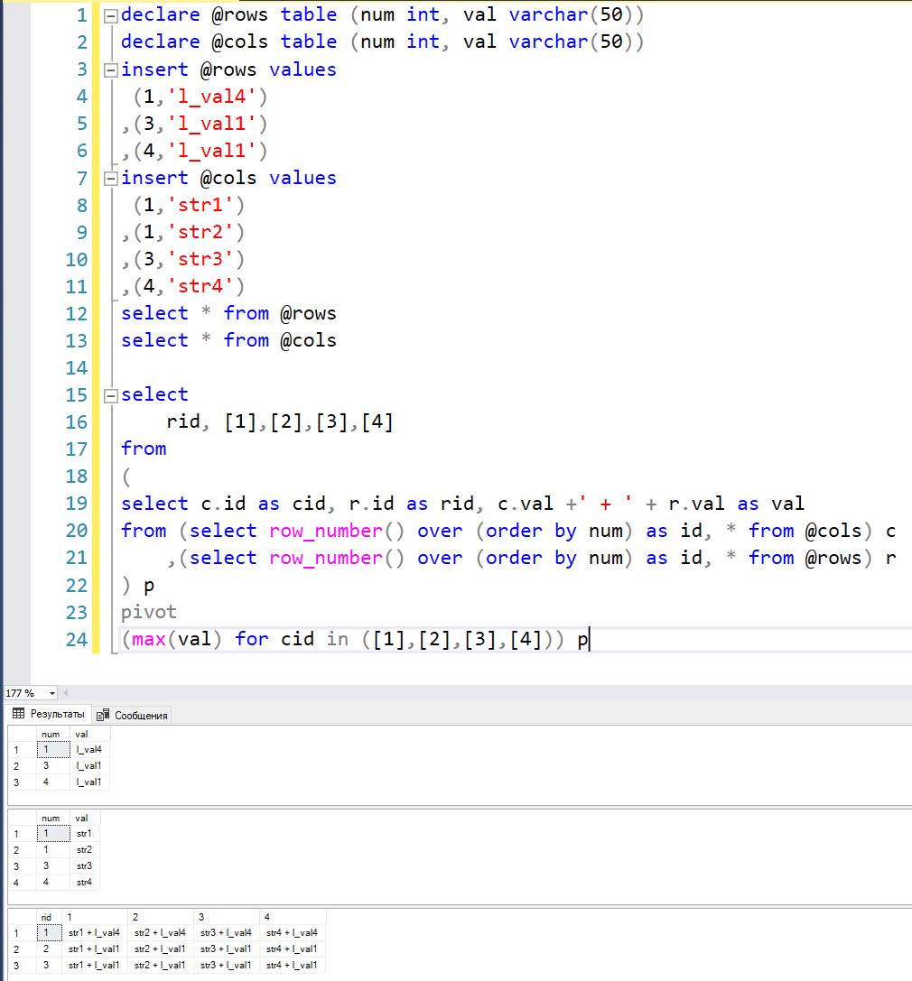 Если имею на входе датасет id1, id2, id3, id4, а на выходе хочу получить одну строку value1, value2, value3, value4? Ну или другими словами, на входе я имею два запроса, один отдает 3 строки, второй 4 строки. А мне надо получить одну таблицу 3 на 4. Размерность заранее неизвестна, но не бесконечна. Наверняка это все уже решено, но я не знаю, по каким словам гуглить. С таблицами сложно. Есть два результата запросов, они промежуточные и нигде не хранятся. Получаются каждый раз, когда юзверь чего-то хочет. 1 l_val4