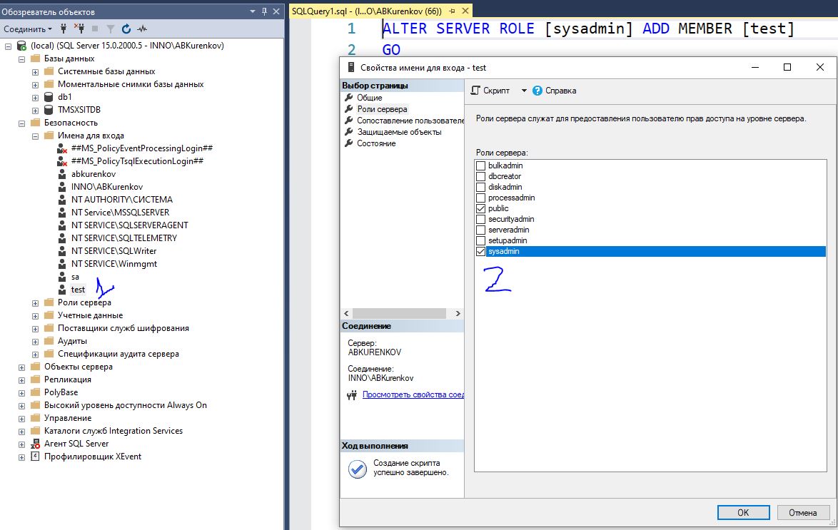 Есть сервер, устанавливался из-под встроенного виндового администратора. При установке был выбран вариант аутентификации "SQL Server and Windows". Учетка встроенного виндового администратора по соображениям безопасности не используется. Надо текущему админу дать права, идентичные правам sa. Логин я создал, а для выдачи прав галочек слишком много, я устану их все тыкать. Где галочка "Пусть будет полным админом"? ... |