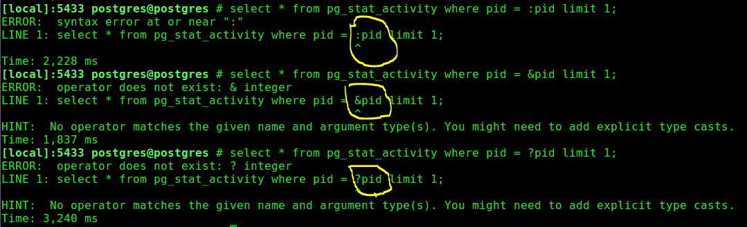psql в так, что ли - не умеет, чтобы сама запрашивать, а не объявлять заранее через "\set pid 99999" ? ... |