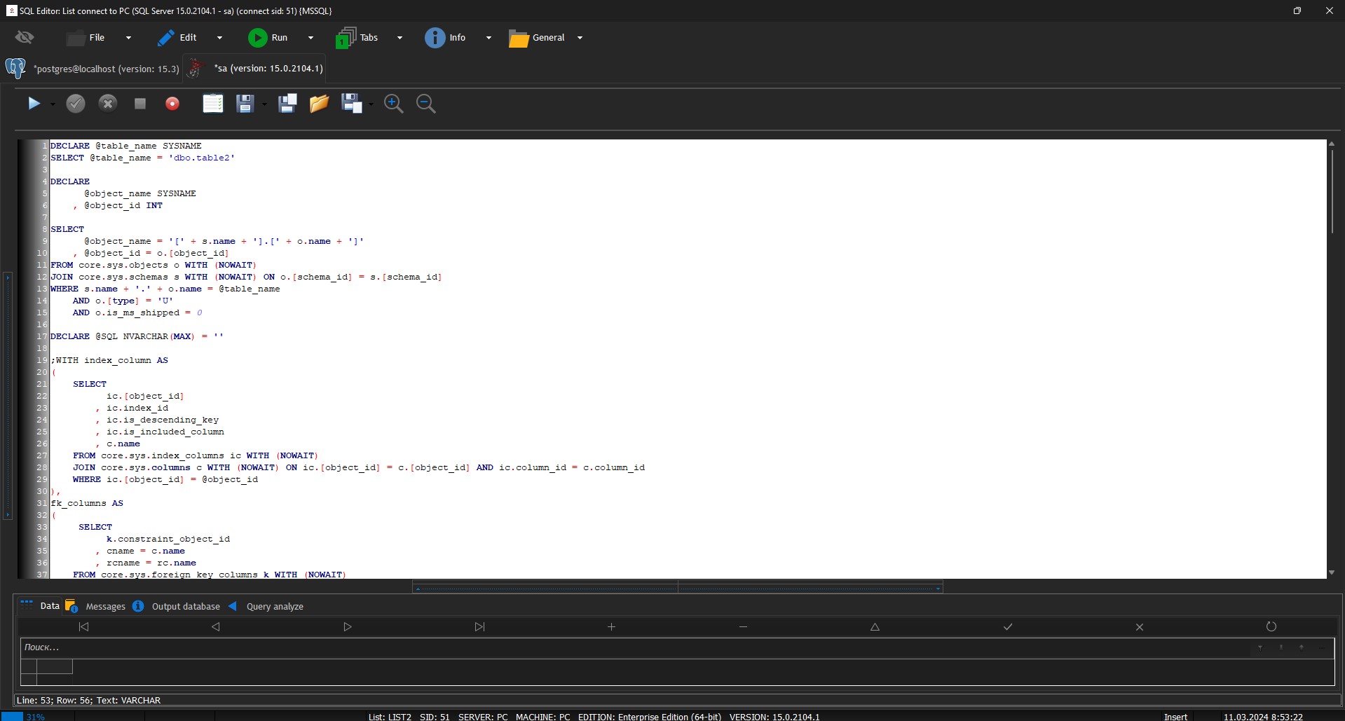 CerebroSQL 24.3 При разработке данной версии основное внимание было уделено работе редактора SQL и вот, что было сделано: 1. Переписали подсказчик кода (Code AutoCompletion), теперь он работает строго внутри границ текущего SQL блока. Разделение блоков внутри подсказчика выполняется по общим правилам для редактора, а именно команды create завершаются символом /, остальные ; 2. Подсказчик кода теперь запоминает используемые ключи для формирования подсказок сохраняет данные в массив и при последующем вводе ключа извлекает данные из памяти. (работает на данный момент для СУБД PostgreSQL, остальные СУБД будут добавлены в следующей версии) Пункты 1 и 2 фактически многократно повышают производительность подсказчика кода! 3. В сетку в заголовки колонок добавлена информация о типе данных колонки в виде кода. 4. В сетке в хинте колонки выводится тип данных 5. Ну и подправили код для оптимизации ширины колонок при загрузке данных в грид. ... |