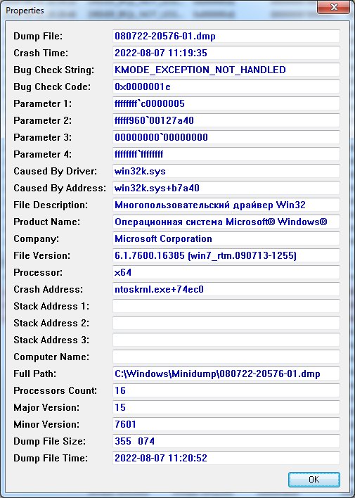 Комп на B450 чипсете, стоит семерка уже год или два, не помню. Все стабильно, только в жаркую погоду приходилось подкручивать обороты на вентиляторе видеокарты. А тут захожу фирефоксом на translate.google.com, комп вылетает в синий экран. Сейчас в комнате жарковато, конечно, но не настолько, чтобы бить тревогу. С чего начинать? С ССД? С памяти? ... |