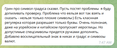хотя можно сделать список разрешенных символов в нике ! ? # № $ & * ( ) + - / только надо это явно указать при регистрации ... |