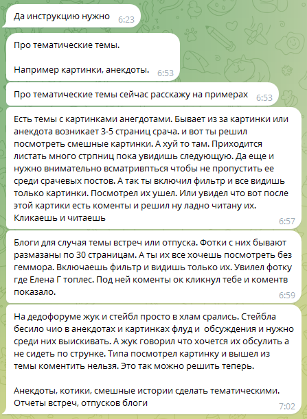 Цитата [игнорируется] Про тематические темы. Например картинки, анекдоты. Есть темы с картинками анегдотами. Бывает из за картинки или анекдота возникает 3-5 страниц срача. и вот ты решил посмотреть смешные картинки. А хуй то там. Приходится листать много стрпниц пока увидишь следующую. Да еще и нужно внимательно всматривпться чтобы не пропустить ее среди срачевых постов. А так ты включил фильтр и все видишь только картинки. Посмотрел их ушел. Или увидел что вот после этой картики есть коменты и решил ну ладно читану их. Кликаешь и читаешь Блоги для случая темы встреч или отпуска. Фотки с них бывают размазаны по 30 страницам. А ты их все хочешь посмотреть без геммора. Включаешь фильтр и видишь только их. Увилел фотку где Елена Г топлес. Под ней коменты ок кликнул тебе и коментв показало. На дедофоруме жук и стейбл просто в хлам срались. Стейбла бесило чио в анекдотах и картинках флуд и обсуждения и нужно среди них выискивать. А жук говорил что хочется их обсулить а не сидеть по струнке. Типа посмотрел картинку и вышел из темы коментить нельзя. Это так можно решить теперь. Анекдоты, котики, смешные истории сделать тематическими. Отчеты встреч, отпусков блоги ... |
