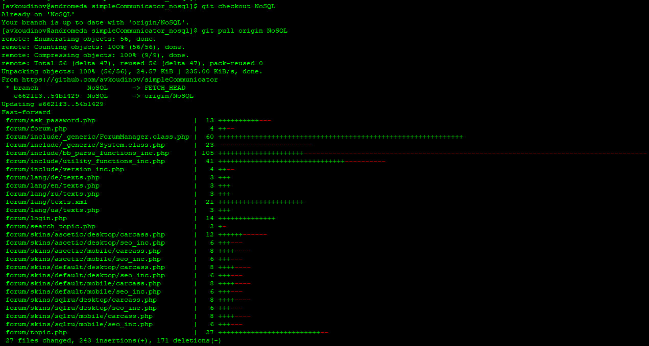 ролик, ты брал версии файлов из ГитХаба из ветки NoSQL? сделал у себя Код: BASH 1. После git clone Код 1. 2. Ну и перед работой проверять надо, что в ветке NoSQL находишься. Код 1. 2. 3. ... |