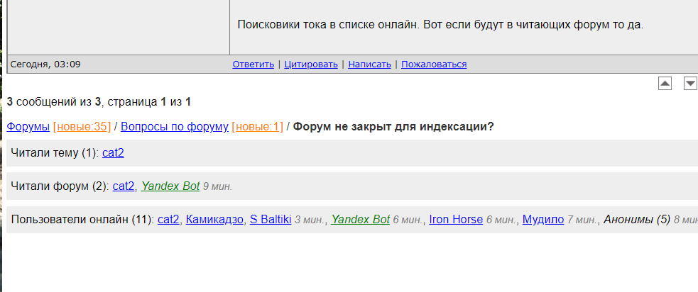 Значит вопросы по форуму индексируются. А в политики есть такое что боты в списке - читают форум? Это недоразумение часто возникало. Люди видели ботов в списке онлан и думали что они читают форум. Списк онлайн это общий по всем форумам. А вот в списке читают форум иличитают тему они не должнв появляться если форум закрыт от индексации ... |