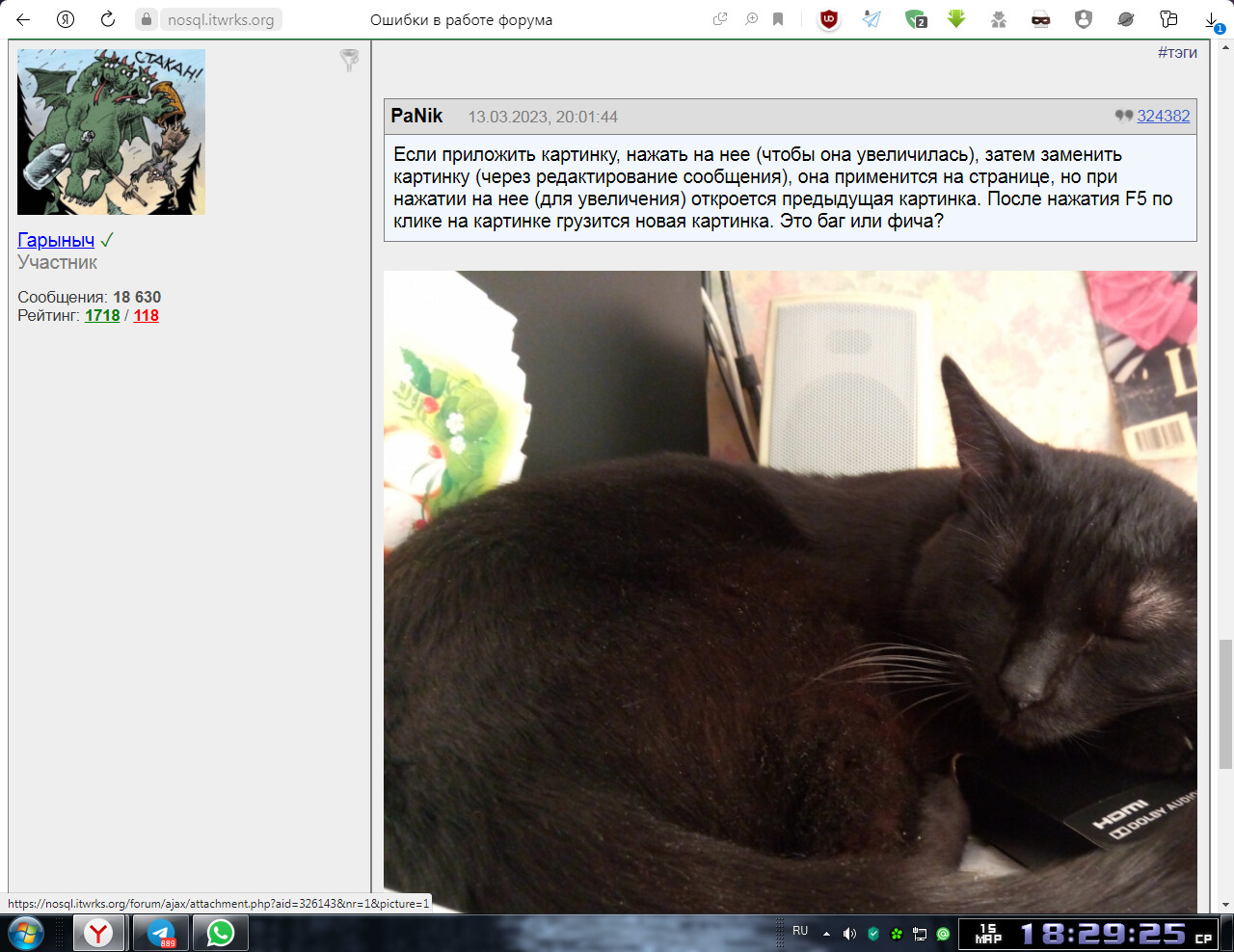 Если приложить картинку, нажать на нее (чтобы она увеличилась), затем заменить картинку (через редактирование сообщения), она применится на странице, но при нажатии на нее (для увеличения) откроется предыдущая картинка. После нажатия F5 по клике на картинке грузится новая картинка. Это баг или фича? ... |