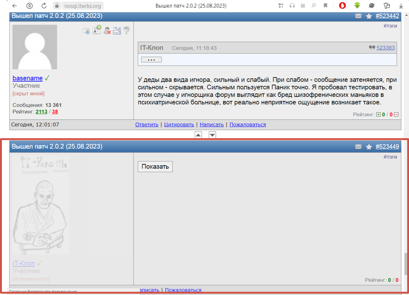 Это осложняло жизнь разрабу, пересчитывать и правильно выводить контекст для игнорщиков Ничего сложного, просто очередной алгоритм. На скуле я это точно отключу, когда выйдет патч. Не вижу смысла кого-то игнорить в проффорумах. Хотя там вряд-ли, конечно, кто-то что-то будет писать уже, но тем не менее. И здесь тоже, оставлю только в ПТ, в Политике. Это хоть какой-то смысл имеет. ... |
