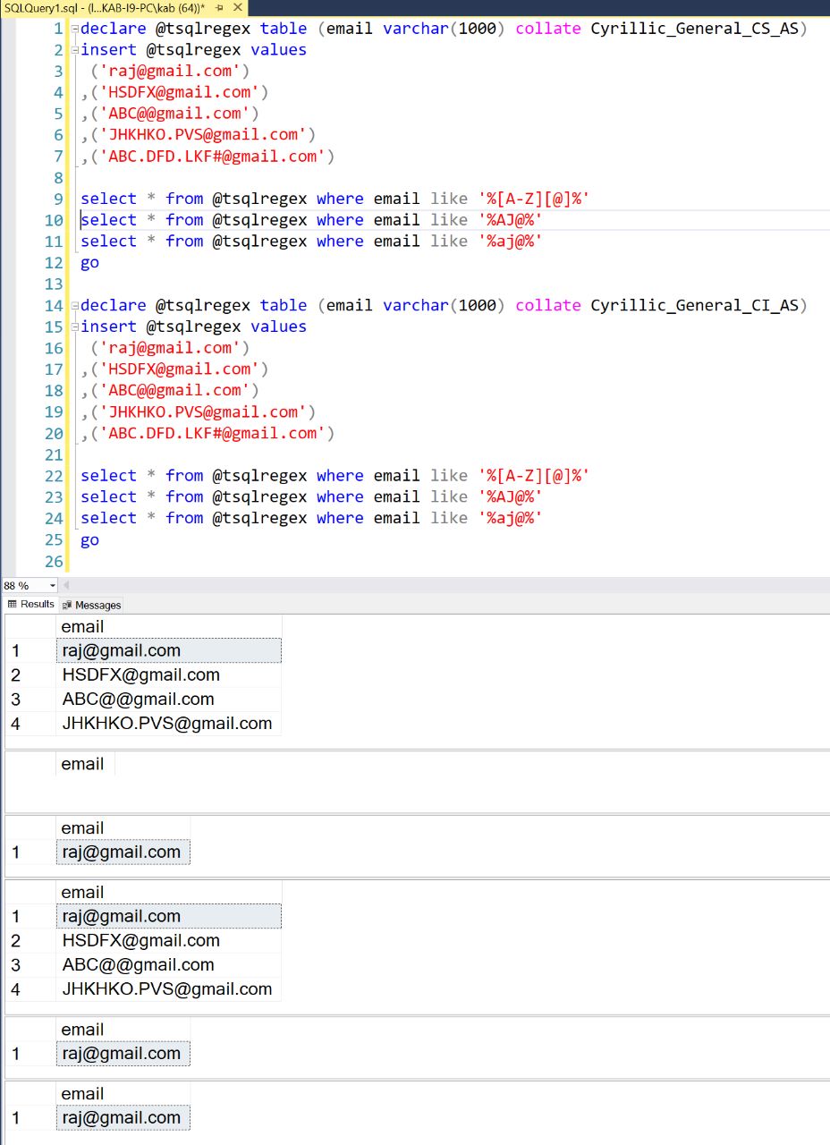 запрос T-SQL: select * from @tsqlregex where email like '%[A-Z][@]%' с коллейтом case sensitive выводит данные не зависимо от регистра... Хотя вроде не должно... как то даже не сталкивался с такой хуйней ) Кто может сталкивался с таким? чозанах? Спойлер Код: SQL 1. 2. 3. 4. 5. 6. 7. 8. 9. 10. 11. 12. 13. 14. 15. 16. 17. 18. 19. 20. 21. 22. 23. 24. 25. ... |