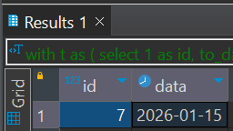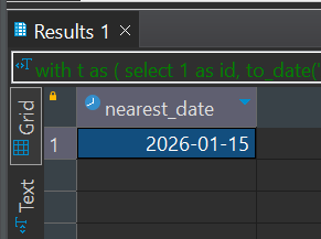 Что всё-таки понимается под "ближайшей датой"? Согласно вашему условию, MIN(датой) для всех записей с Id <> 1 является 01.14.26, а не 01.15.26. из остальных ИД надо найти бОльшую дату , чем 01.14.26 ( у них ид=1) т.е. ответом должно быть ид=7, дате= 01.15.26 ... |