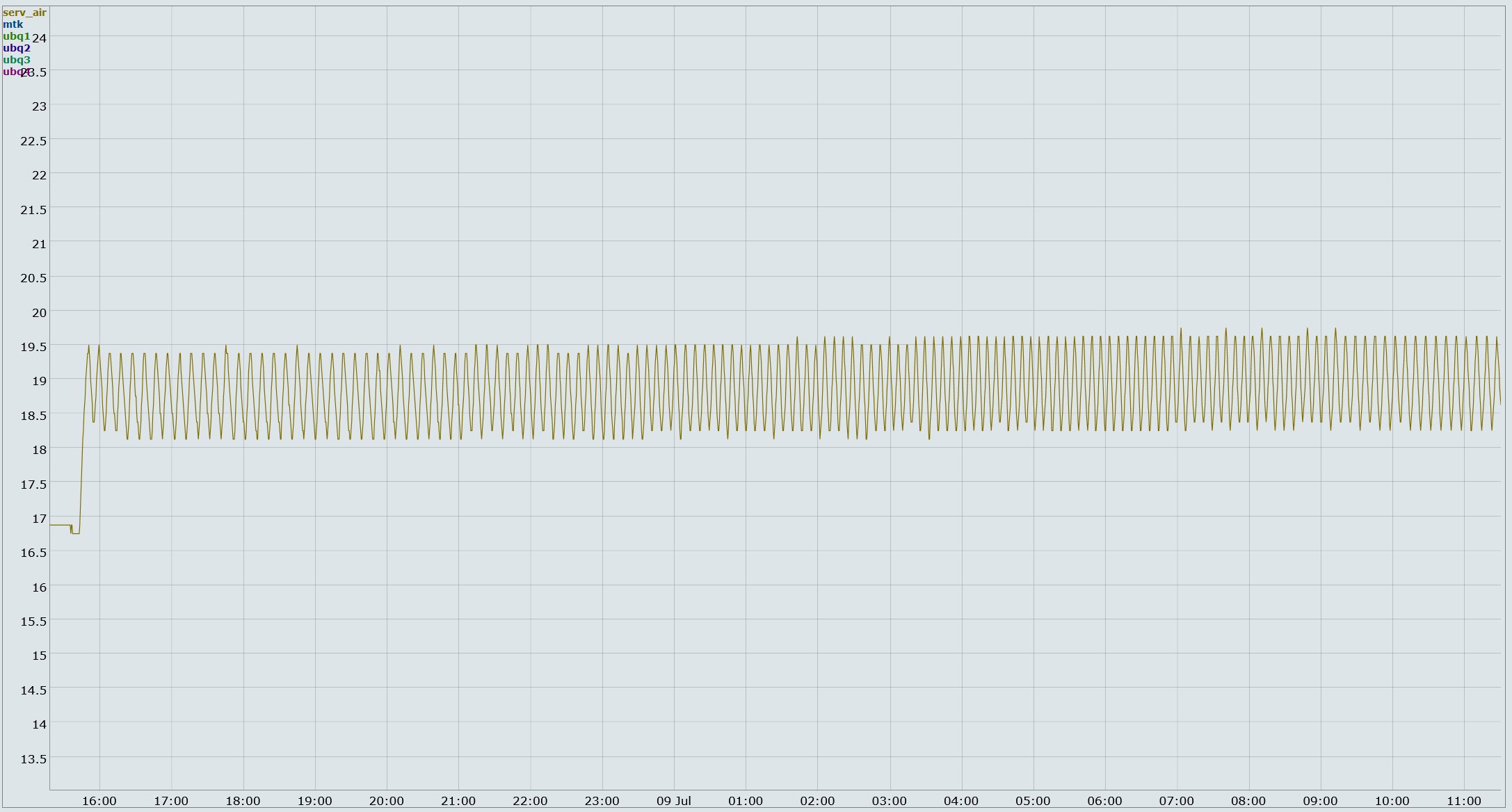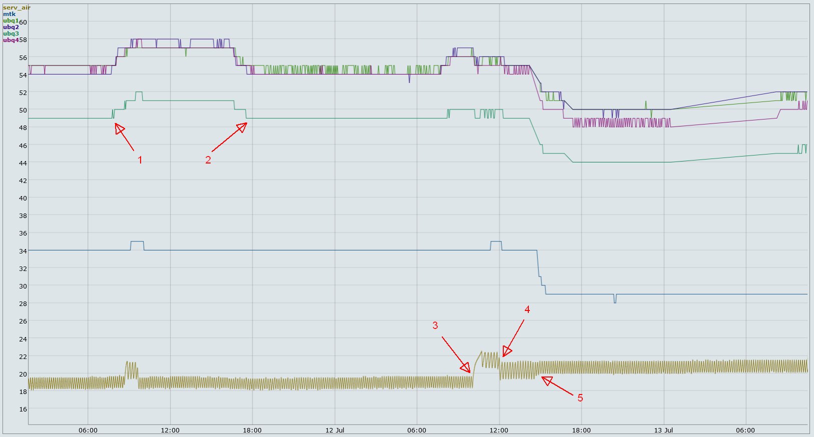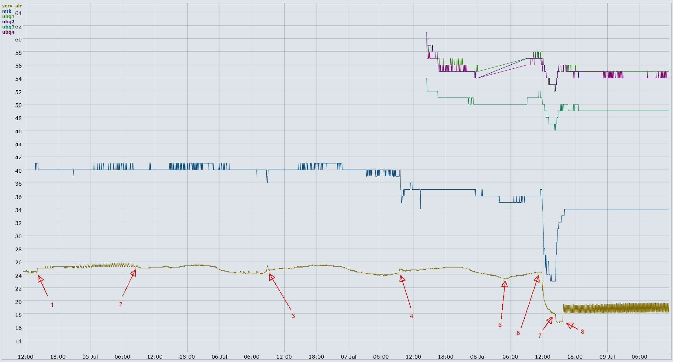 Начало тут. Осторожно, там мат и угар. Чем построить масштабируемый график? Замеряю температуру в серверной каждые 30 секунд с точностью 1/8 градуса. Как потом оказалось, такая точность не лишняя. В 40 сантиметрах от пола, с лицевой стороны стойки. Там у меня башенные серваки стоят. На графике - нижняя линия. Не забываем, что сплит меряет температуру у себя наверху, под потолком. Это вносит некоторые коллизии в общую картину. Также каждые три минуты беру температуру на Микротике и Убиквити. У последней 4 датчика, какой за что отвечает, неясно, поэтому решил брать все. Убиквити очень горячая, пацаны говорят, она у них годами на 70° работает и ничего. Это верхние 4 линии. Сплит дует прямо на стойку с лицевой стороны. Он явно неисправен. Точка (1) - это я закрыл дверь в серверную в рабочее время. То есть воздух из офисного помещения участвовал в охлаждении серверной. На промежутке между (1) и (2) температура на сплите была выставлена так, чтобы он не молотил постоянно, а иногда выключался. Потом я решил, что пусть себе молотит. Плавные волны на участке от (2) до (6) - это результат суточных колебаний температуры снаружи. То есть, внешнему блоку не все равно, что вокруг него, а он стоит на складе с металлической крышей, там жарче, чем на улице и ночной холод до него добирается на сразу, но добирается. В точке (3) очень интересный момент. Отключилось электричество ненадолго, температура в серверной стала расти, а Микротику почему-то похорошело на 2 градуса. Может, потому что у большинства пользователей компы выключились и они перестали в интернет лезть, а может, воздушные потоки вокруг стройки как-то странно перераспределились. Сплит перестал дуть, а бесперебойник добавил жару. Странно. А, ну да, чуть не забыл. Конечно, я хожу и капаю на мозги нашему главному строителю/эксплуатационщику, чтобы починил мне сплит. Он вырос из хорошего инженера в менеджеры (может, наоборот, даунгрэйдился?) и решил, что надо сперва испробовать все доступные простые методы, а потом уже вызывать спецов. В принципе, правильно. В точке (4) почистили внутренний и внешний блоки и открыли дополнительные ворота на складе. Сплит начал дуть и Микротику сразу похорошело на три градуса. А открытие ворот дало минус пол-градуса ночью (точка (5)). Микротик это тоже заметил. В точке (6) наконец приехал спец и залил хладоген в систему. Теперь сплит не просто дует, а гонит холодный воздух. Микротику похорошело очень хорошо, и Убиквити это тоже понравилось. В точке (7) я убавил обороты вентилятора на сплите, с максимальных на средние. Просто посмотреть, что будет. Получилось плохо. Температура воздуха упала, а железки стали греться. В точке (8) я поднял температуру на сплите, чтобы он стал выключаться. Пошла ровная расчесочка, от семи до девяти включений в час. Видно, что за полтора дня зубчики расчески поднялись на 0.4°. В понедельник вечером будет ясно, это утечка хладогена или какие-то другие факторы. Ну что я могу сказать? У меня две стоечные одноюнитовые железки, которые отдают тепло на корпус. То есть, у них вообще нет никакого собственного активного охлаждения. Чтобы их охладить, на них надо дуть вентилятором, а понижение температуры воздуха в серверной ничего не дает. Убиквити я давно расположил в двух юнитах, а Микротик у меня сверху зажат мини-АТС. Снизу есть небольшое пространство, там два не-стоечных устройства 