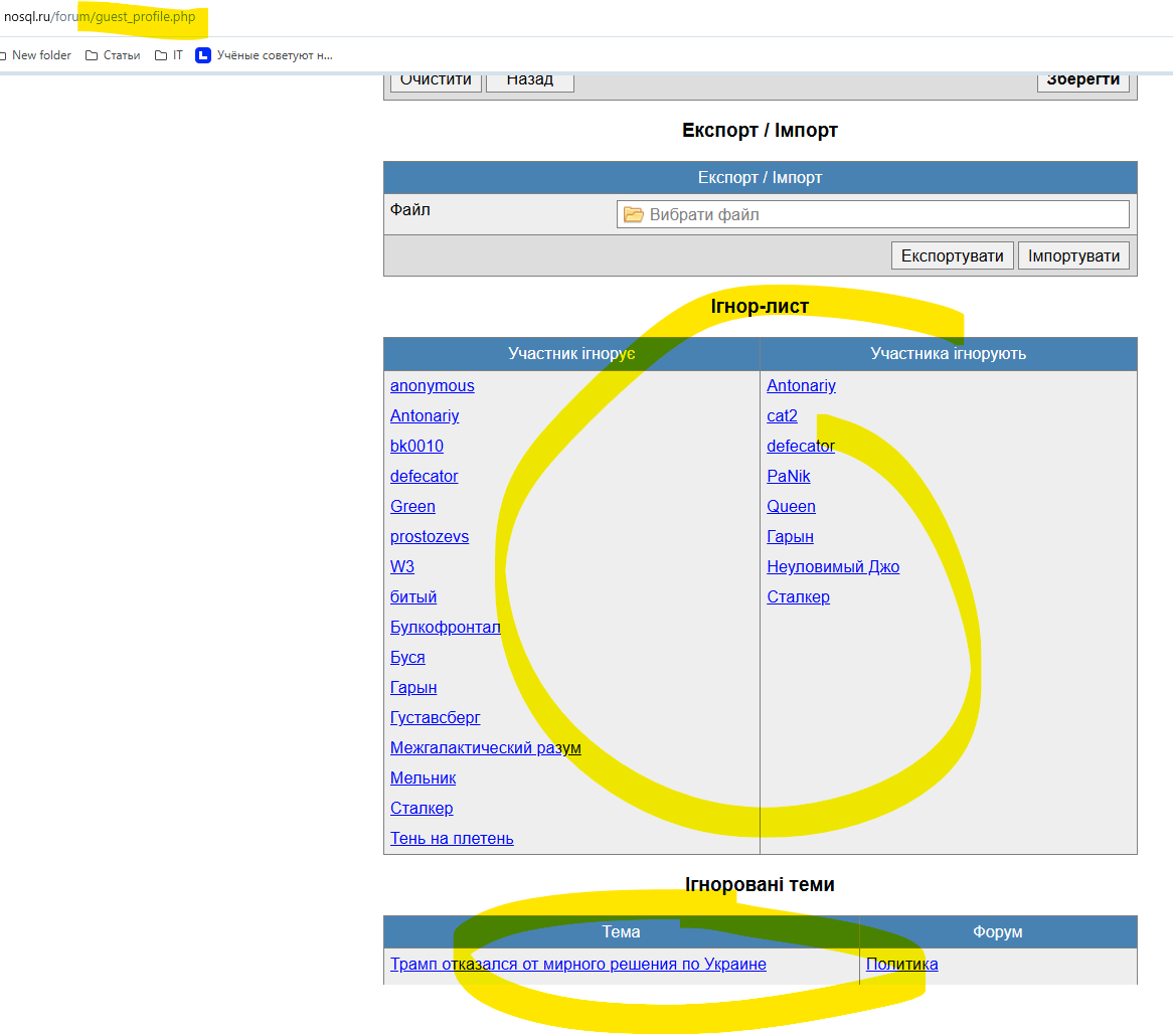 Тьі в курсе, что давно уж не работает кнобка "очистить" в интерфейсе гєста? Что именное по твоему не работает. Опиши как воспроизвести проблему. заигнореные не удаляются, и темы тоже вот , сразу после очистки А типа пого гостем 1 я этих игнорю а под гостем 2 нет, это гарынство какое то. ... |