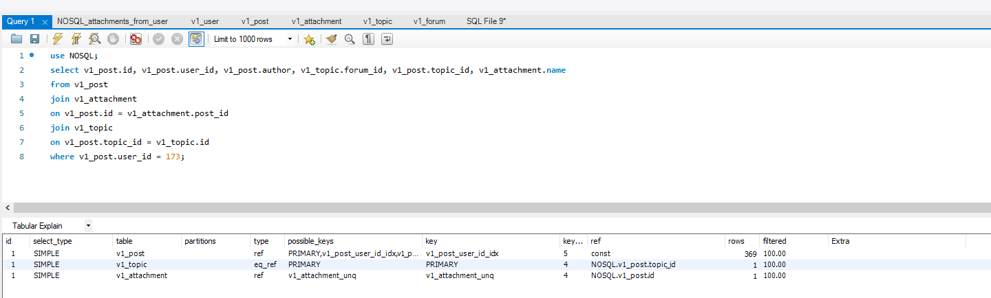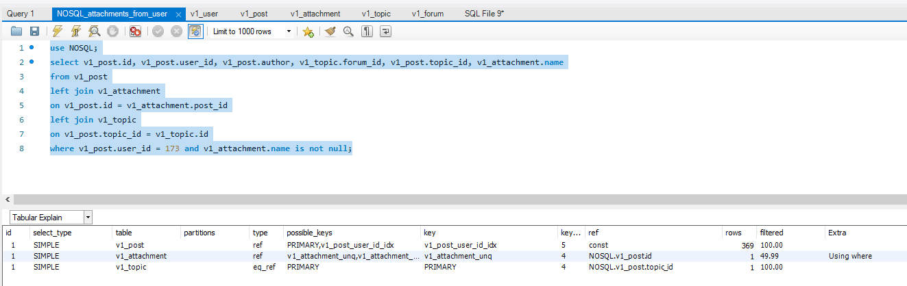 Горбатый ёж [игнорируется] Вот ещё вывод explain analyze Как только в читабельном виде отобразить... join Цитата [игнорируется] '-> Nested loop inner join (cost=473.95 rows=424) (actual time=0.235..3.066 rows=197 loops=1)\n -> Nested loop inner join (cost=325.38 rows=369) (actual time=0.154..1.790 rows=369 loops=1)\n -> Index lookup on v1_post using v1_post_user_id_idx (user_id=173) (cost=196.23 rows=369) (actual time=0.144..1.183 rows=369 loops=1)\n -> Single-row index lookup on v1_topic using PRIMARY (id=v1_post.topic_id) (cost=0.25 rows=1) (actual time=0.001..0.001 rows=1 loops=369)\n -> Index lookup on v1_attachment using v1_attachment_unq (post_id=v1_post.id) (cost=0.29 rows=1) (actual time=0.003..0.003 rows=1 loops=369)\n' Цитата [игнорируется] '-> Nested loop left join (cost=419.06 rows=212) (actual time=0.137..2.520 rows=197 loops=1)\n -> Nested loop inner join (cost=344.79 rows=212) (actual time=0.130..1.888 rows=197 loops=1)\n -> Index lookup on v1_post using v1_post_user_id_idx (user_id=173) (cost=196.21 rows=369) (actual time=0.093..0.869 rows=369 loops=1)\n -> Filter: (v1_attachment.`name` is not null) (cost=0.29 rows=1) (actual time=0.002..0.003 rows=1 loops=369)\n -> Index lookup on v1_attachment using v1_attachment_unq (post_id=v1_post.id) (cost=0.29 rows=1) (actual time=0.002..0.002 rows=1 loops=369)\n -> Single-row index lookup on v1_topic using PRIMARY (id=v1_post.topic_id) (cost=0.25 rows=1) (actual time=0.003..0.003 rows=1 loops=197)\n' ... |